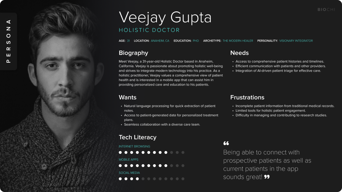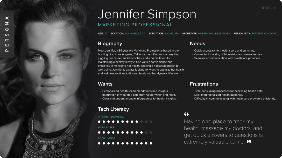 By combining user personas, journey maps, and competitive analysis, BioChi’s design not only solved for user pain points but also set a new benchmark for holistic healthcare platforms. The system was built to empower patients with actionable insights, strengthen provider collaboration, and ultimately foster long-term wellness outcomes — projecting meaningful impact at both the individual and industry level.