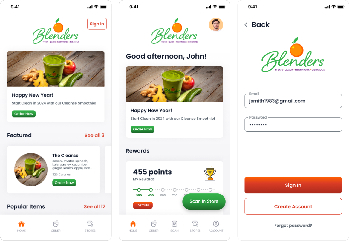Blenders is a modern mobile app for ordering drinks, snacks, and retail items. With sleek design, in-store scanning, and built-in rewards, it delivers a seamless experience that drives customer loyalty and sales.